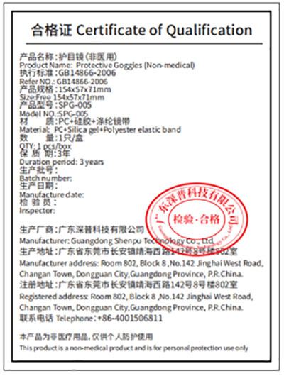 3.Briller (med ventilationshuller) Anti-tåge Parameter specifications